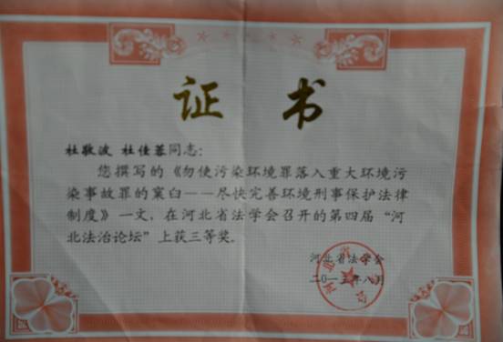 2013年年8月,我系11级法学1班杜佳蓉同学的《勿使污染环境罪落入重大环境污染事故罪的窠臼—— 尽快完善环境刑事保护法律制度》一文在2013年河北法学会举办的第四届“河北法治论坛”上获三等奖。