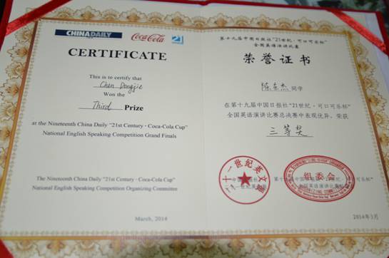 2014年3月24日,我系英语专业陈东杰同学在由中国日报社、可口可乐大中华区联合主办,二十一世纪英语教育传媒承办的第十九届中国日报社“21世纪可口可乐杯”全国英语演讲比赛决赛中表现优异,荣获三等奖。